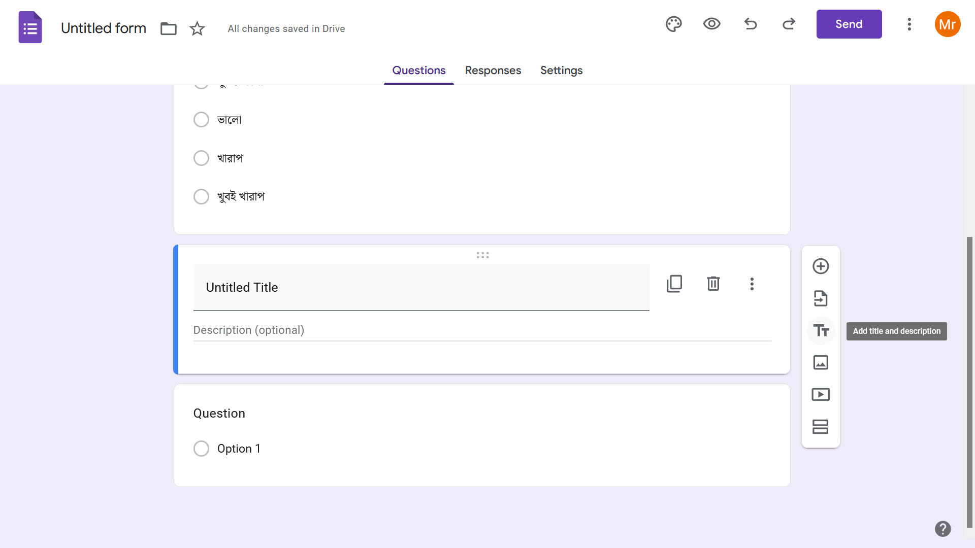 - গুগল ফর্মে প্রশ্ন যুক্ত করার জন্য, ফর্মের ডানপাশের মেনুবার থেকে প্লাস (+) অপশনটিতে ক্লিক করুন।