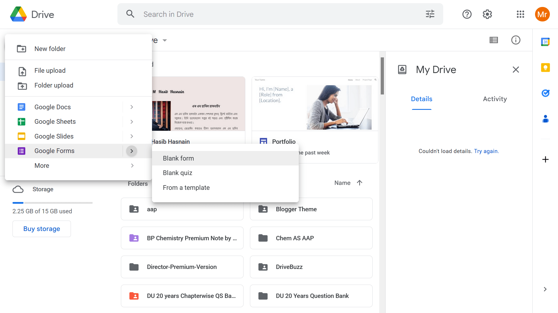 - হোমপেজের উপরের দিকে থাকা বাম কর্নারের মেনু বার থেকে New অপশনে ক্লিক করে Google Forms বাছাই করুন।